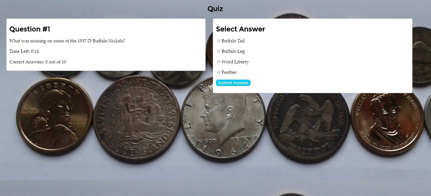 I wanted to put together a coin quiz to try to make more of an interest in coin collecting. Right now, the user gets 10 questions. They have 20 seconds to answer each question. They are given four choices. A correct or incorrect response is given as a description at the bottom. So far, I have 100 questions that appear at random.