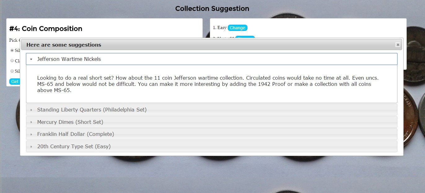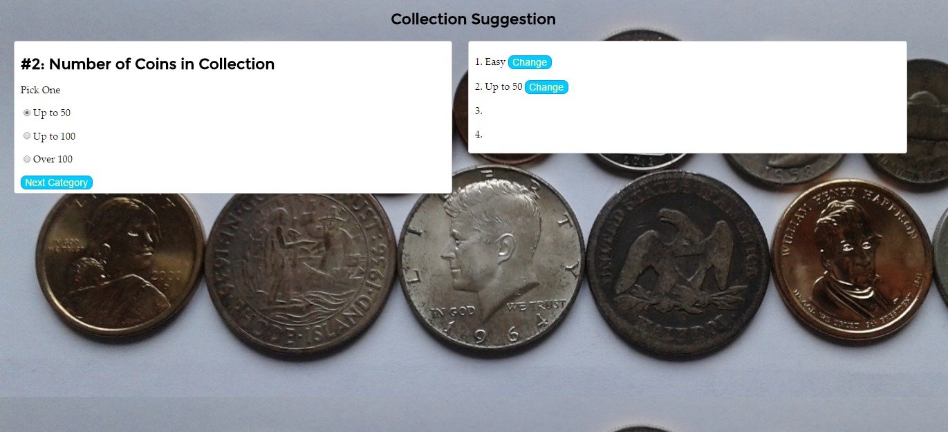 This is to help someone who is starting coin collecting or a collector who is not sure what to collect next. The user is given 4 options: Difficulty (Easy, Medium or Challenging), Number of Coins in Set, Condition and Composition. Once all 4 are picked, a pop-up box will appear with up to 5 possibilities of what to collect. The user can always change any of their responses to try to get a different list of suggestions.